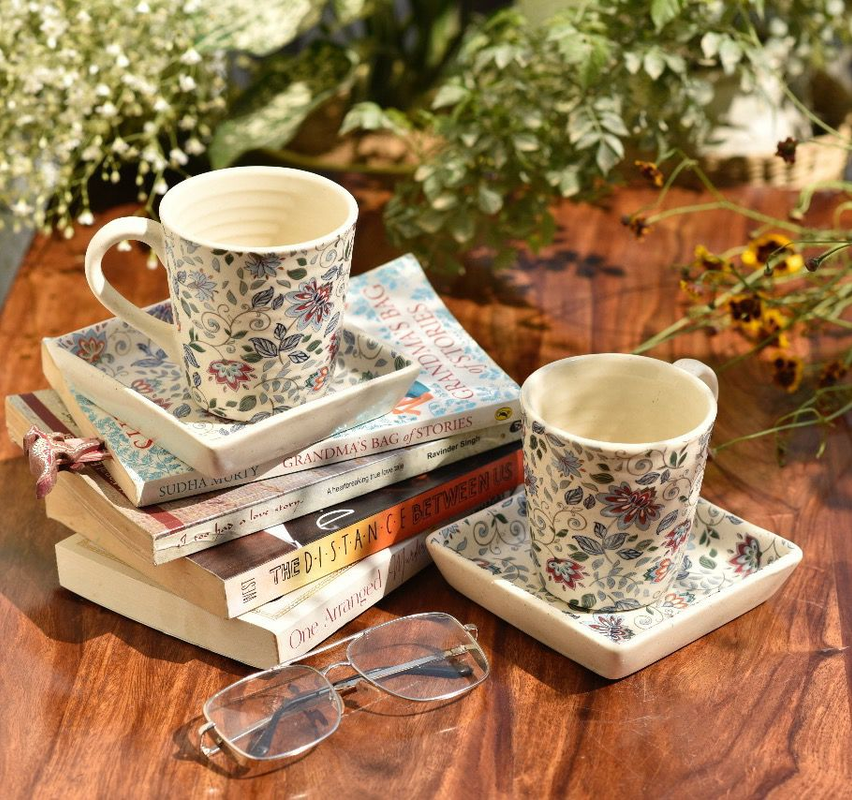 Material – Ceramic stoneware Dimension – Mug -330ml Platter -4*4inch Style – Multicolour Pacakage content – Set of 4( 2 mugs & 2 platter)Food safe Lead freeMicrowave safe Dishwasher safe